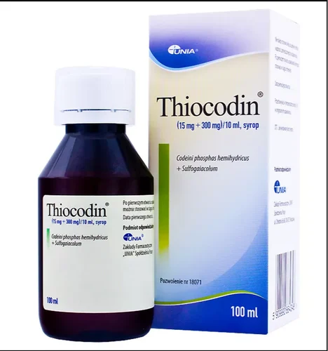 Thiocodin Syrup is a cough syrup that typically contains codeine phosphate and thiamine hydrochloride as its active ingredients. It is primarily used as a cough suppressant and may also have some analgesic properties. Thiocodin Syrup is commonly prescribed to provide temporary relief from persistent, non-productive coughs. It should be used strictly as directed by a healthcare professional, as codeine, an opioid medication, carries the risk of side effects and has the potential for abuse and addiction. It is important to consult with a healthcare professional or pharmacist for personalized advice and guidance regarding the appropriate use of Thiocodin Syrup.